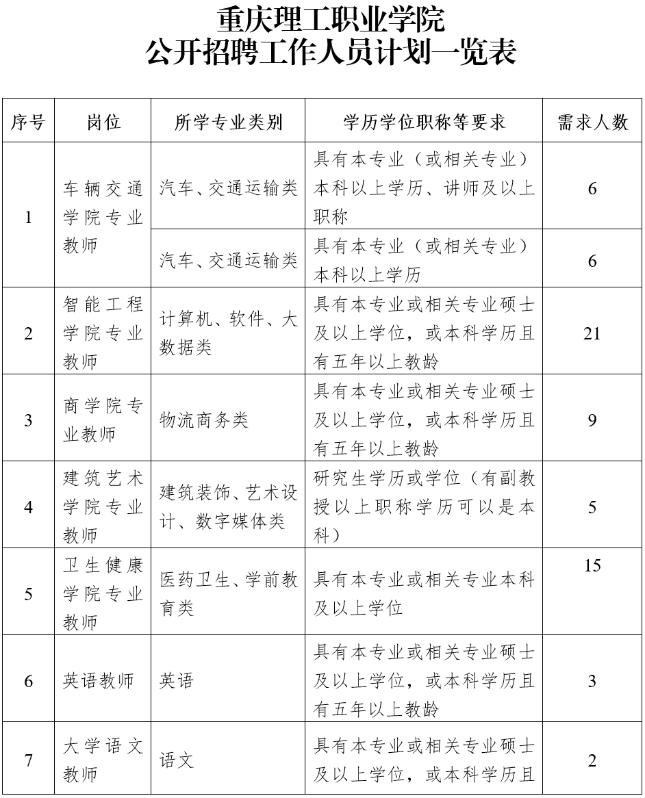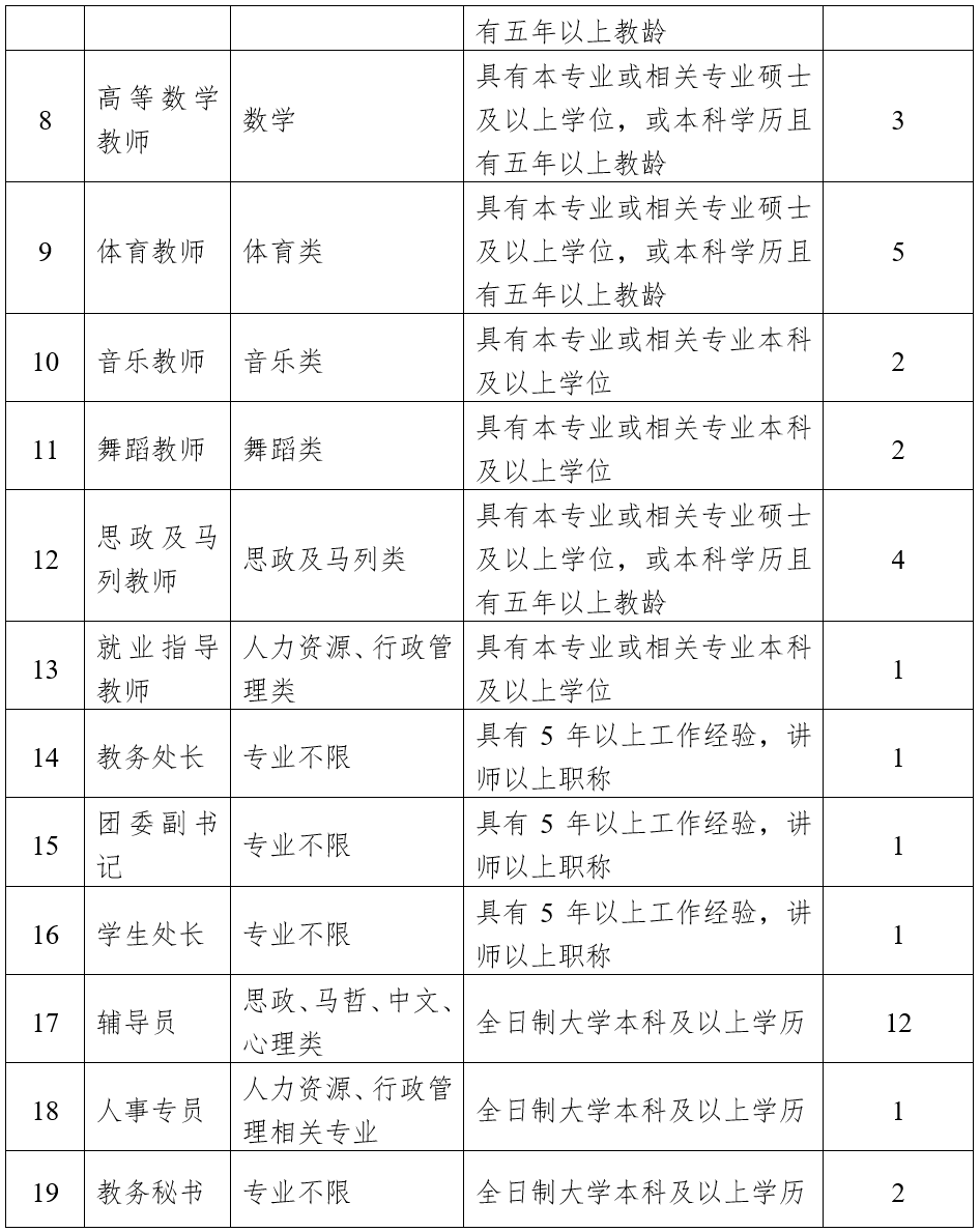 2、计划招聘工作人员102人,其中教学类84人、辅导员类12人、行政类6人,具体岗位、应聘条件等详细情况见《公开招聘工作人员计划一览表》(附件1)